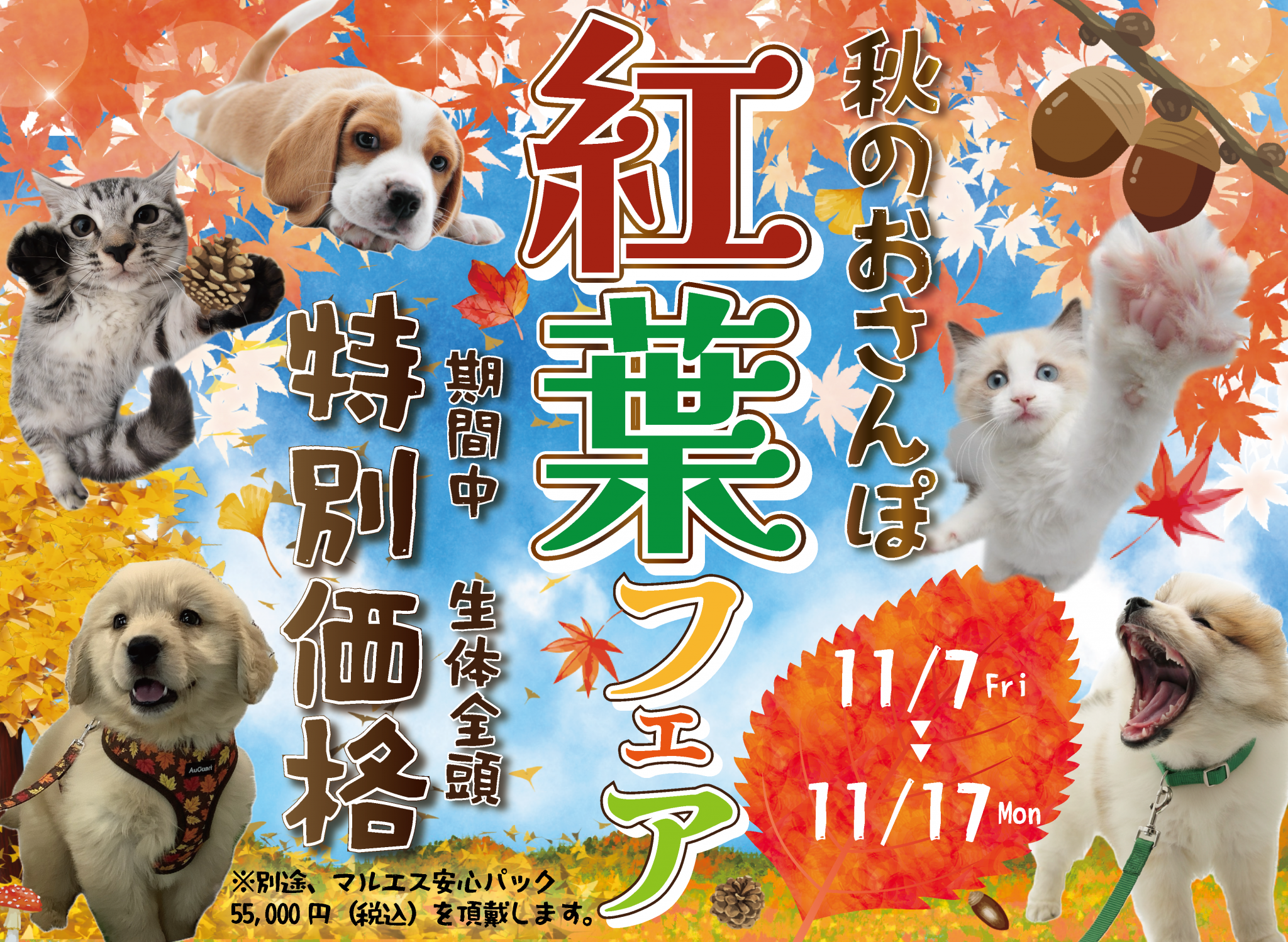 性別 こだわらない 男の子 女の子 種類で探す 未指定 チワワロングチワワスムースパピヨンポメラニアンミニチュアピンシャーヨークシャテリアマルチーズトイプードルシーズーミニチュアダックス・ロングミニチュアダックス・スムースジャックラッセルテリアスピッツビションフリーゼミニチュアシュナウザービーグル柴犬豆柴ペキニーズパグボストンテリアブルドッグキャバリアボーダーコリーシベリアンハスキーバセットハウンドセントバーナードスタンダードプードルウェルシュコーギーイタリアングレーハウンドアメリカン・コッカーカニヘンダックス・ロングハーフグレートピレニーズニューファンドランドシェットランドシープドッグ秋田犬ミニチュアプードル紀州犬イングリッシュコッカーウィペットフレンチブルアメリカンコッカーラブラドールレトリーバーゴールデンレトリーバーミニチュアダックスフンドホワイト・スイス・シェパードグレート・ピレニーズミックスシャーペイハーフ(マルプー)ハーフ(ドゥードル)フラットコーテッドレトリーバーカニヘンダックス・スムースミニチュアブルテリア 価格で探す ~ 円 ※半角数字でご入力ください。 店舗で探す 未指定 いかるが店奈良店はんな店押熊店枚岡店富雄店キャットファームドッグファームペットアミ富士見台店HS生駒店段原SC店レオン動物病院富士店島田店ホームアシスト店清水駒越店湯河原店御殿場店千鳥町店相模大野店稲沢HL店岡崎美合店 性別 こだわらない 男の子 女の子 種類で探す 未指定 アメリカンショートヘアスコティッシュフォールドブリティッシュショートヘアノルウェージャンメインクーンマンチカンペルシャエキゾチックベンガルロシアンブルーソマリラグドールシンガプーラエキゾチックショートヘアハーフミヌエットラガマフィンヒマラヤンシャムスコティッシュストレートサイベリアンエキゾチックロングヘアジェネッタスフィンクス 価格で探す ~ 円 ※半角数字でご入力ください。 店舗で探す 未指定 いかるが店奈良店はんな店押熊店枚岡店富雄店キャットファームドッグファームペットアミ富士見台店HS生駒店段原SC店レオン動物病院富士店島田店ホームアシスト店清水駒越店湯河原店御殿場店千鳥町店相模大野店稲沢HL店岡崎美合店 新しい仲間たち(ワンちゃん) 一覧へ 新しい仲間たち(ワンちゃん) トイプードル(動画あり) 男の子 2024/08/04 価格:¥283,800 新しい仲間たち(ネコちゃん) 一覧へ 新しい仲間たち(ネコちゃん) ラグドール(動画あり) 男の子 2025/05/10 価格:¥258,000 ミヌエット(動画あり) 男の子 2025/09/08 価格:¥316,800 おすすめ ワンちゃん一覧へ おすすめ ワンちゃん パピヨン(動画あり) 女の子 2025/08/29 価格:¥393,800 ハーフ(チワワ×M.ダックス)(動画あり) 男の子 2025/09/12 価格:¥268,000 チワワロング(動画あり) 男の子 2025/09/06 価格:¥184,800 ミニチュアダックス・ロング(動画あり) 男の子 2025/09/05 価格:¥173,800 ミニチュアピンシャー(動画あり) 男の子 2025/08/27 価格:¥173,800 ラブラドールレトリーバー(動画あり) 男の子 2025/07/18 価格:¥151,800 ビションフリーゼ(動画あり) 男の子 2025/07/05 価格:¥151,800 マルチーズ(動画あり) 男の子 2025/09/14 価格:¥250,800 ミニチュアダックス・スムース(動画あり) 男の子 2025/08/03 価格:¥168,000 ハーフ(チワワ×M.ダックス)(動画あり) 女の子 2025/09/12 価格:¥268,000 ミニチュアダックス・スムース(動画あり) 男の子 2025/09/05 価格:¥195,800 ビションフリーゼ(動画あり) 男の子 2025/08/27 価格:¥217,800 おすすめ ネコちゃん一覧へ おすすめ ネコちゃん スコティッシュフォールド(動画あり) 男の子 2025/09/17 価格:¥184,800 ノルウェージャン 女の子 2025/09/10 価格:¥184,800 アメリカンショートヘア(動画あり) 男の子 2025/09/04 価格:¥184,800 ペルシャ(動画あり) 男の子 2025/08/22 価格:¥258,000 ペルシャ(動画あり) 男の子 2025/08/07 価格:¥198,000 ノルウェージャン(動画あり) 女の子 2025/08/20 価格:¥188,000 スコティッシュフォールド(動画あり) 男の子 2025/09/17 価格:¥184,800 アメリカンショートヘア(動画あり) 男の子 2025/09/04 価格:¥168,000 ミヌエット(動画あり) 男の子 2025/07/13 価格:¥261,800 ミヌエット(動画あり) 女の子 2025/08/07 価格:¥298,000 ラグドール 男の子 2025/09/10 価格:¥107,800 スコティッシュフォールド(動画あり) 男の子 2025/08/30 価格:¥198,000 デビュー前 ワンちゃん一覧へ デビュー前 ワンちゃん ビションフリーゼ コメント参照 2025/11/06 価格:お問い合わせください シーズー コメント参照 2025/11/04 価格:お問い合わせください シーズー コメント参照 2025/10/18 価格:お問い合わせください ハーフ(ポメラニアン×チワワ) コメント参照 2025/09/28 価格:お問い合わせください キャバリア コメント参照 2025/10/10 価格:お問い合わせください ハーフ(マルチーズ×トイプードル) コメント参照 2025/10/25 価格:お問い合わせください シーズー コメント参照 2025/10/13 価格:お問い合わせください マルチーズ コメント参照 2025/09/28 価格:お問い合わせください チワワロング コメン
