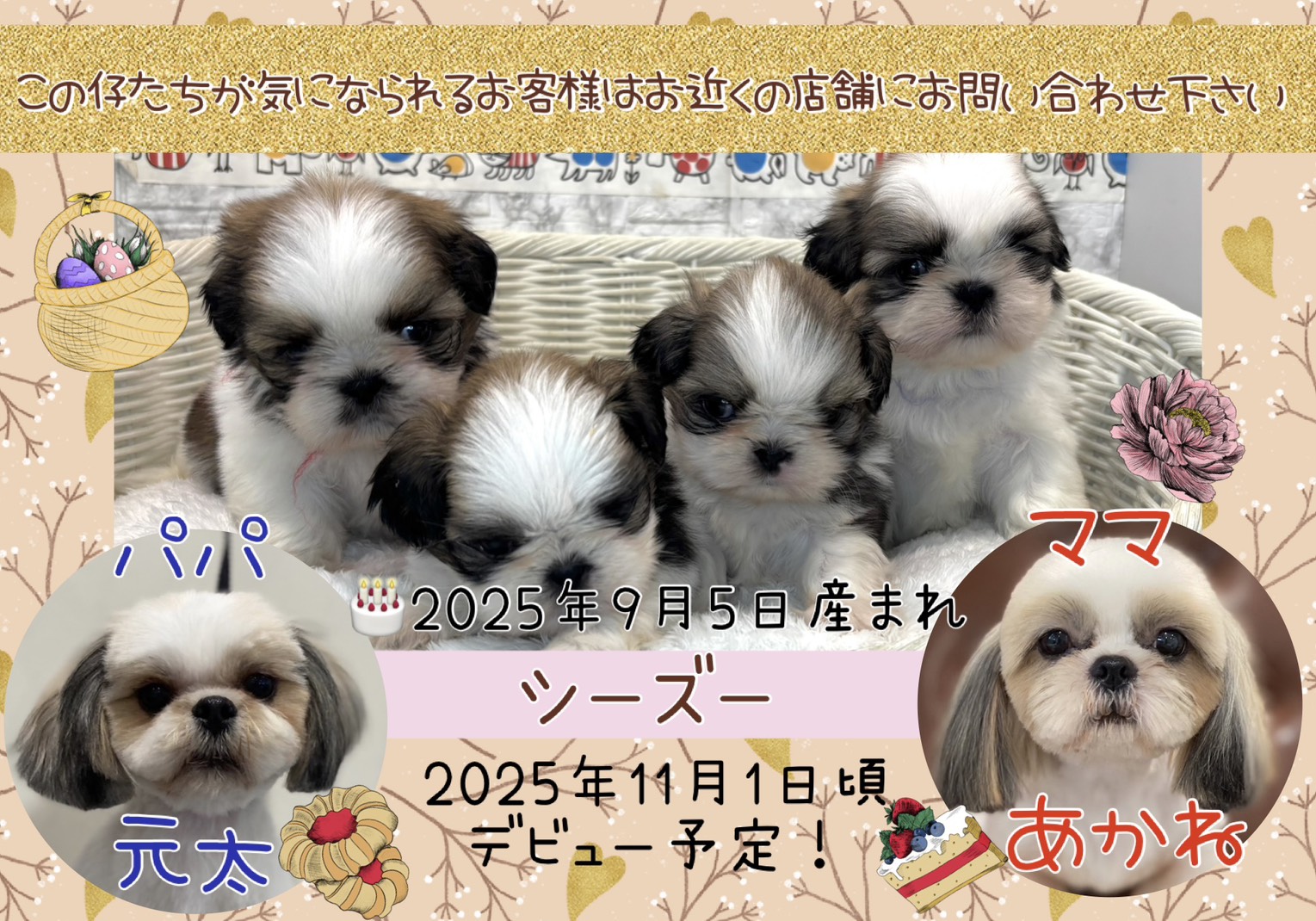 | コメント | シーズーの男の子2頭、女の子2頭の4つ仔ちゃん パパ ママ 立派に成長してくれました デビュー予定日 ※価格は決まり次第、追記致します この仔達が気になられるお客様は、お近くの店舗にお問い合わせください |