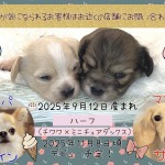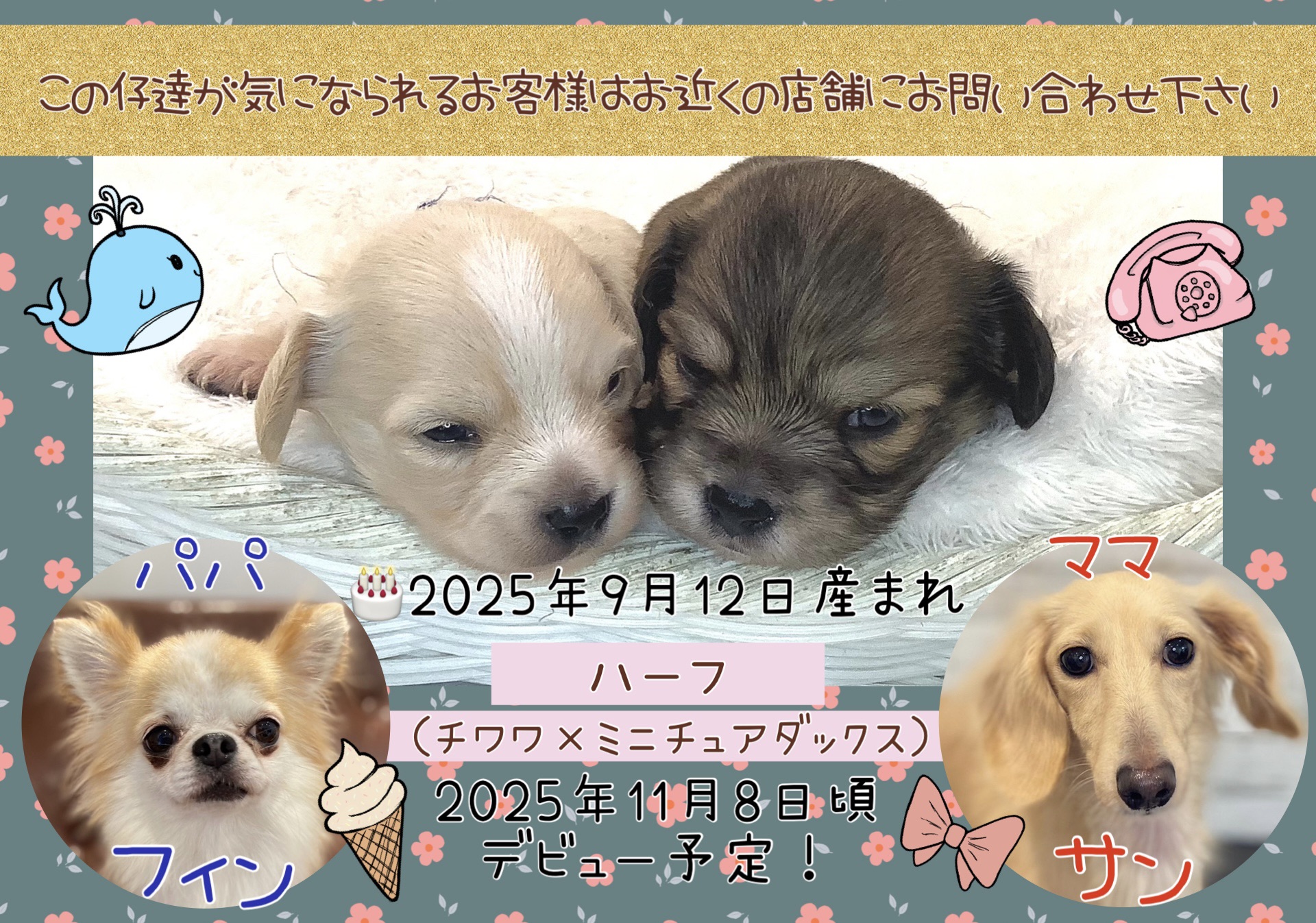 コメント | ハーフの男の子1頭、女の子1頭の双子ちゃん パパ ママ 目が開いてすくすく成長中です デビュー予定日 ※価格は決まり次第、追記致します この仔達が気になられるお客様は、お近くの店舗にお問い合わせください |