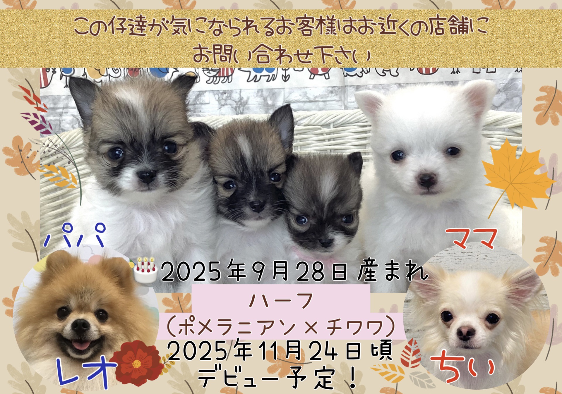 | コメント | ハーフの男の子2頭♂、女の子2頭♀の4つ仔ちゃん パパ ママ 立派に成長してくれました デビュー予定日 ※価格は決まり次第、追記致します この仔達が気になられるお客様は、お近くの店舗にお問い合わせください |