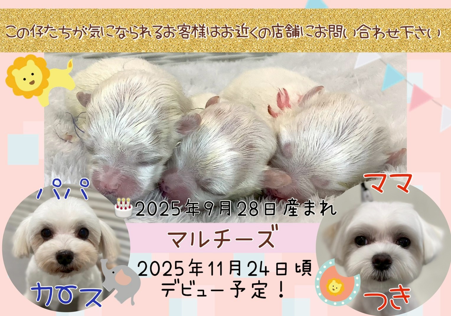 コメント | マルチーズの男の子2頭、女の子1頭の3つ仔ちゃん パパ ママ これからの成長が楽しみです デビュー予定日 ※価格は決まり次第、追記致します この仔達が気になられるお客様は、お近くの店舗にお問い合わせください |