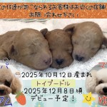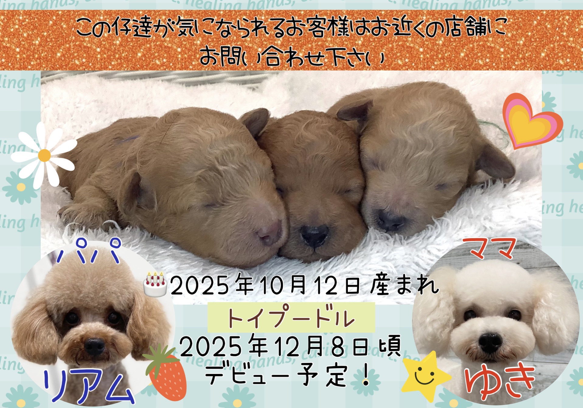 コメント | トイプードル男の子2頭の女の子1頭の3つ仔ちゃん パパ ママ これからの成長が楽しみです デビュー予定日 ※価格は決まり次第、追記致します この仔達が気になられるお客様は、お近くの店舗にお問い合わせください |