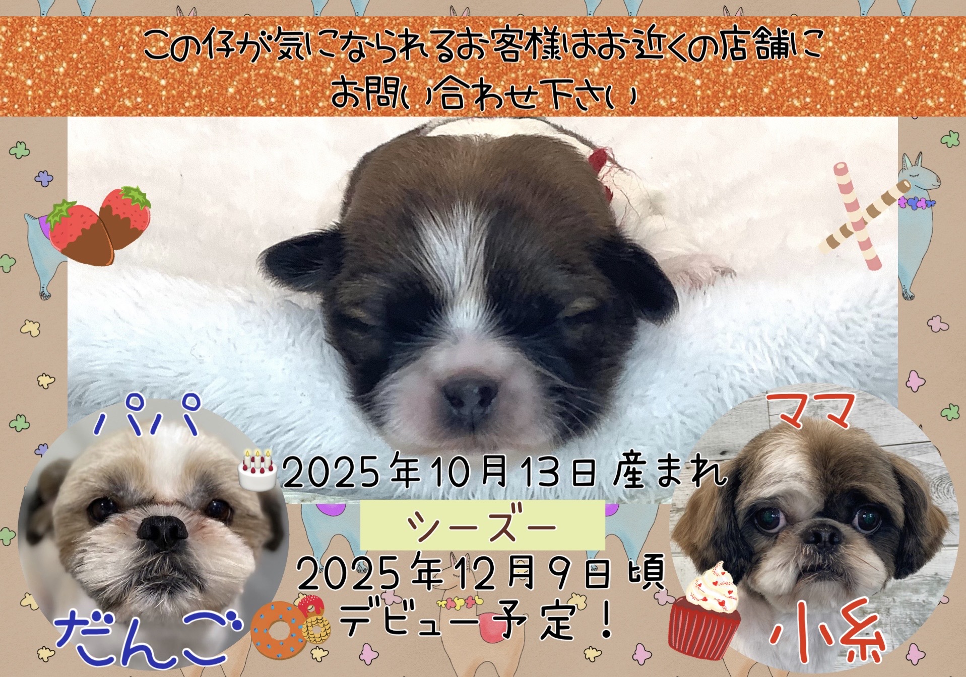 コメント | シーズー女の子1頭のひとりっ仔ちゃん パパ ママ これからの成長が楽しみです デビュー予定日 ※価格は決まり次第、追記致します この仔が気になられるお客様は、お近くの店舗にお問い合わせください |