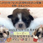 コメント | シーズー女の子1頭のひとりっ仔ちゃん パパ ママ これからの成長が楽しみです デビュー予定日 ※価格は決まり次第、追記致します この仔が気になられるお客様は、お近くの店舗にお問い合わせください |