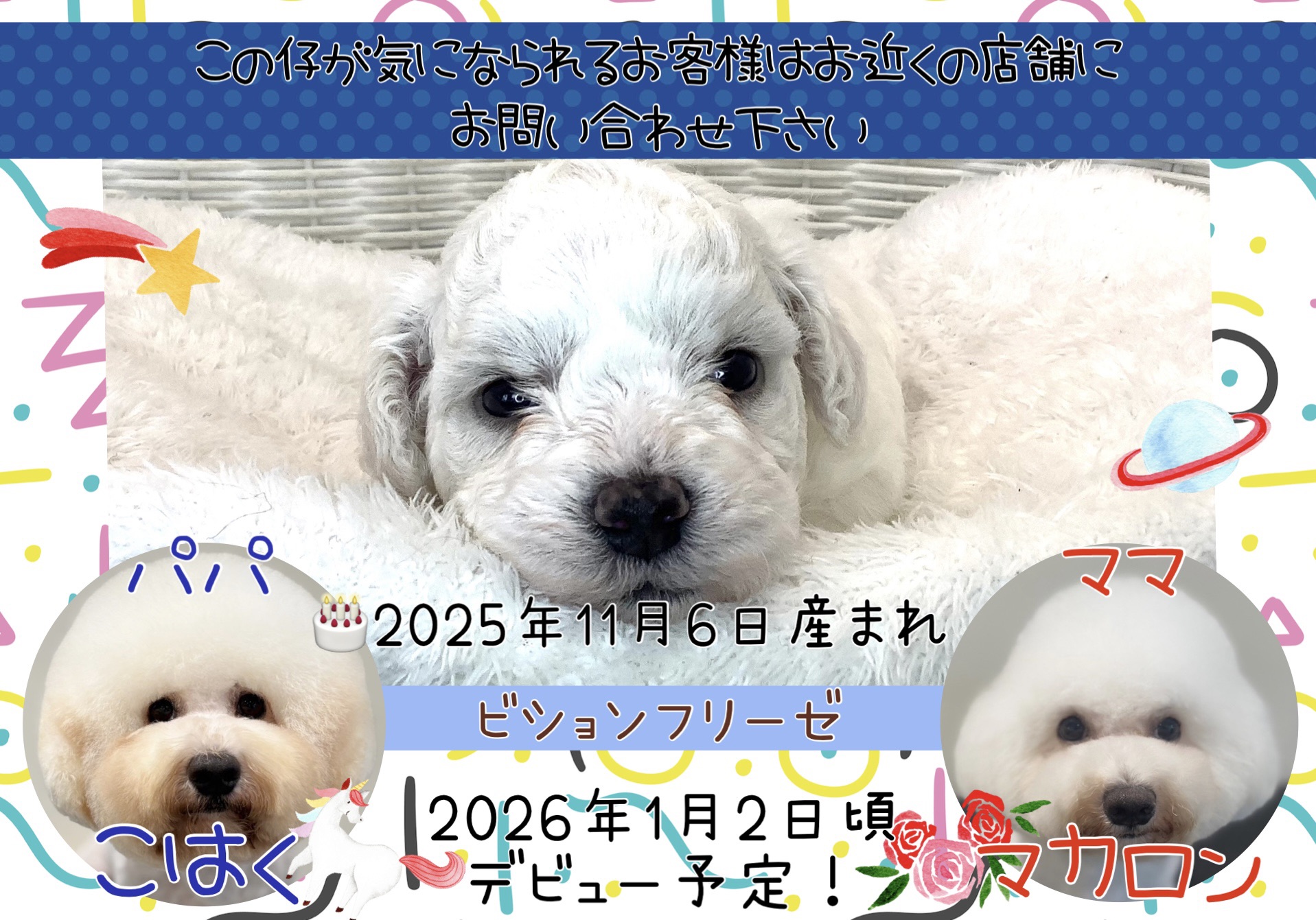 | コメント | ビションフリーゼ女の子1頭♀の1人っ仔ちゃん パパ ママ 目が開いてすくすく成長中です デビュー予定日 ※価格は決まり次第、追記致します この仔が気になられるお客様は、お近くの店舗にお問い合わせください |