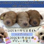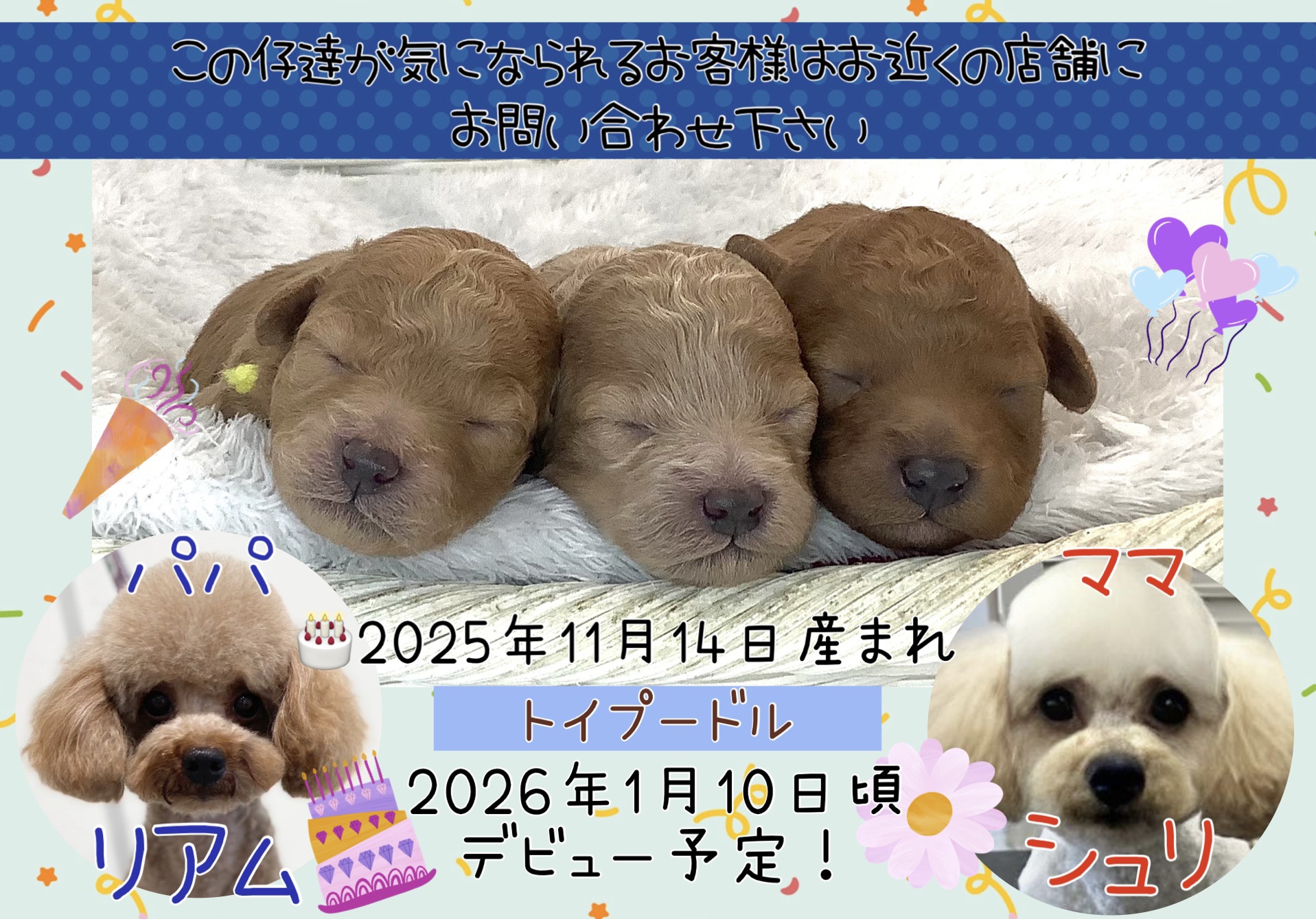 | コメント | トイプードル男の子3頭♂の3つ仔ちゃん パパ ママ これからの成長が楽しみです デビュー予定日 ※価格は決まり次第、追記致します この仔達が気になられるお客様は、お近くの店舗にお問い合わせください |