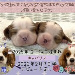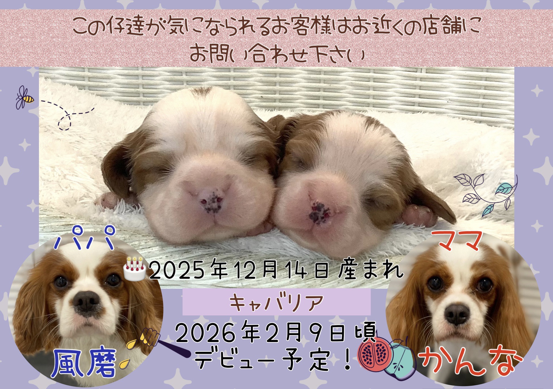 | コメント | キャバリア男の子2頭♂双子ちゃん パパ ママ これからの成長が楽しみです デビュー予定日 ※価格は決まり次第、追記致します この仔達が気になられるお客様は、お近くの店舗にお問い合わせください |