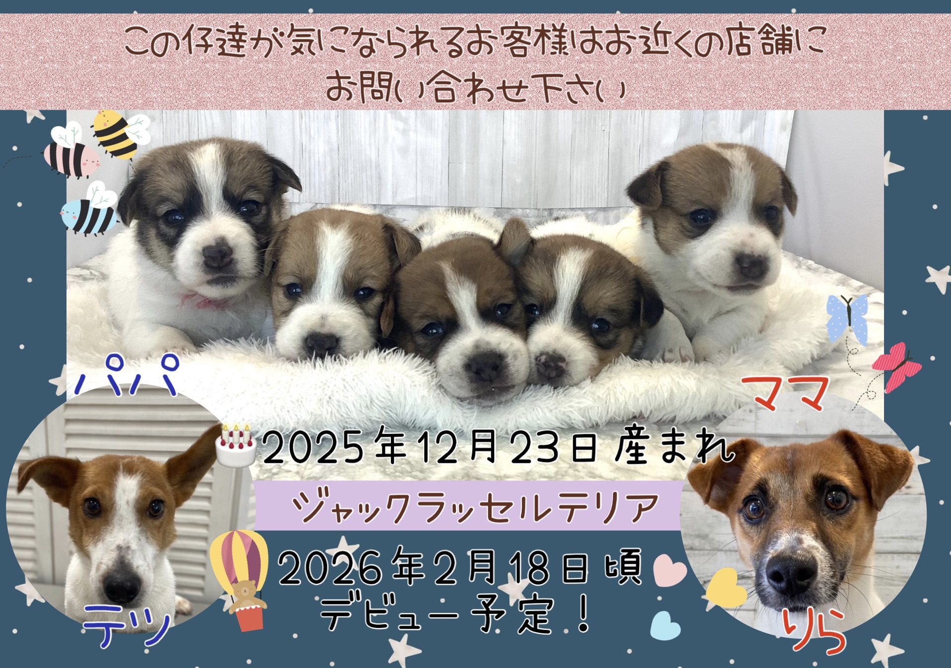 | コメント | ジャックラッセルテリア男の子2頭♂、女の子3頭♀5つ仔ちゃん パパ ママ 目が開いてすくすく成長中です デビュー予定日 ※価格は決まり次第、追記致します この仔達が気になられるお客様は、お近くの店舗にお問い合わせください |