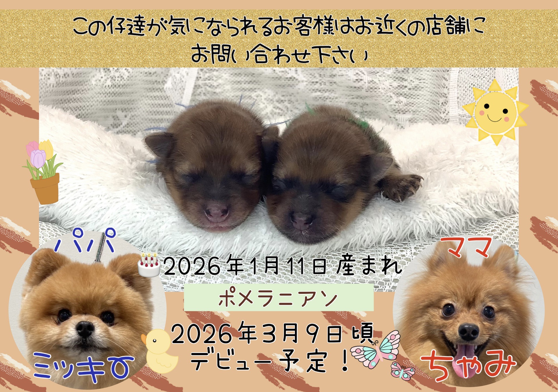 | コメント | ポメラニアン男の子2頭♂ふたごちゃん パパ ママ これからの成長が楽しみです デビュー予定日 ※価格は決まり次第、追記致します この仔達が気になられるお客様は、お近くの店舗にお問い合わせください |
