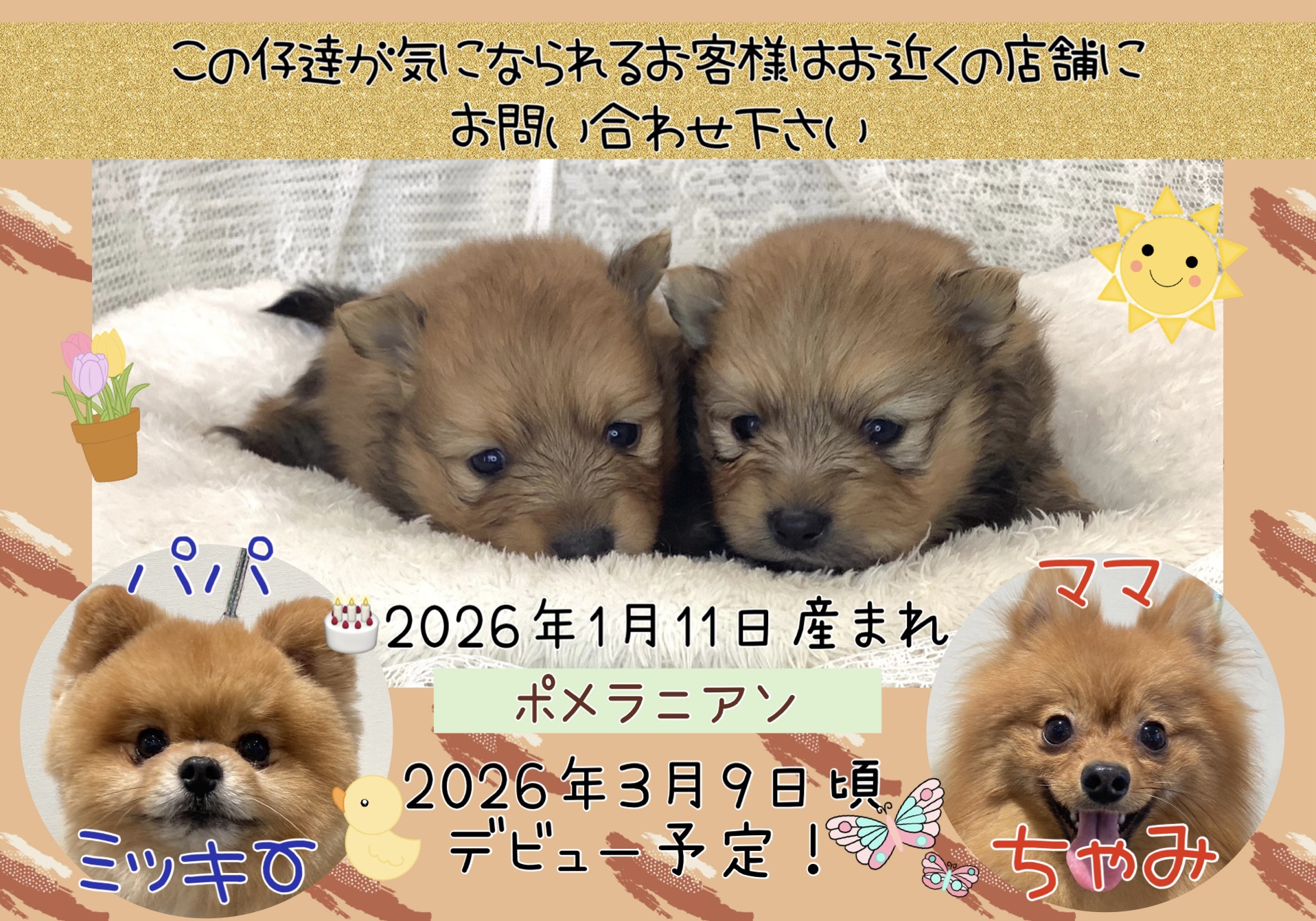 | コメント | ポメラニアン男の子2頭♂ふたごちゃん パパ ママ 目が開いてすくすく成長中です デビュー予定日 ※価格は決まり次第、追記致します この仔達が気になられるお客様は、お近くの店舗にお問い合わせください |