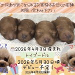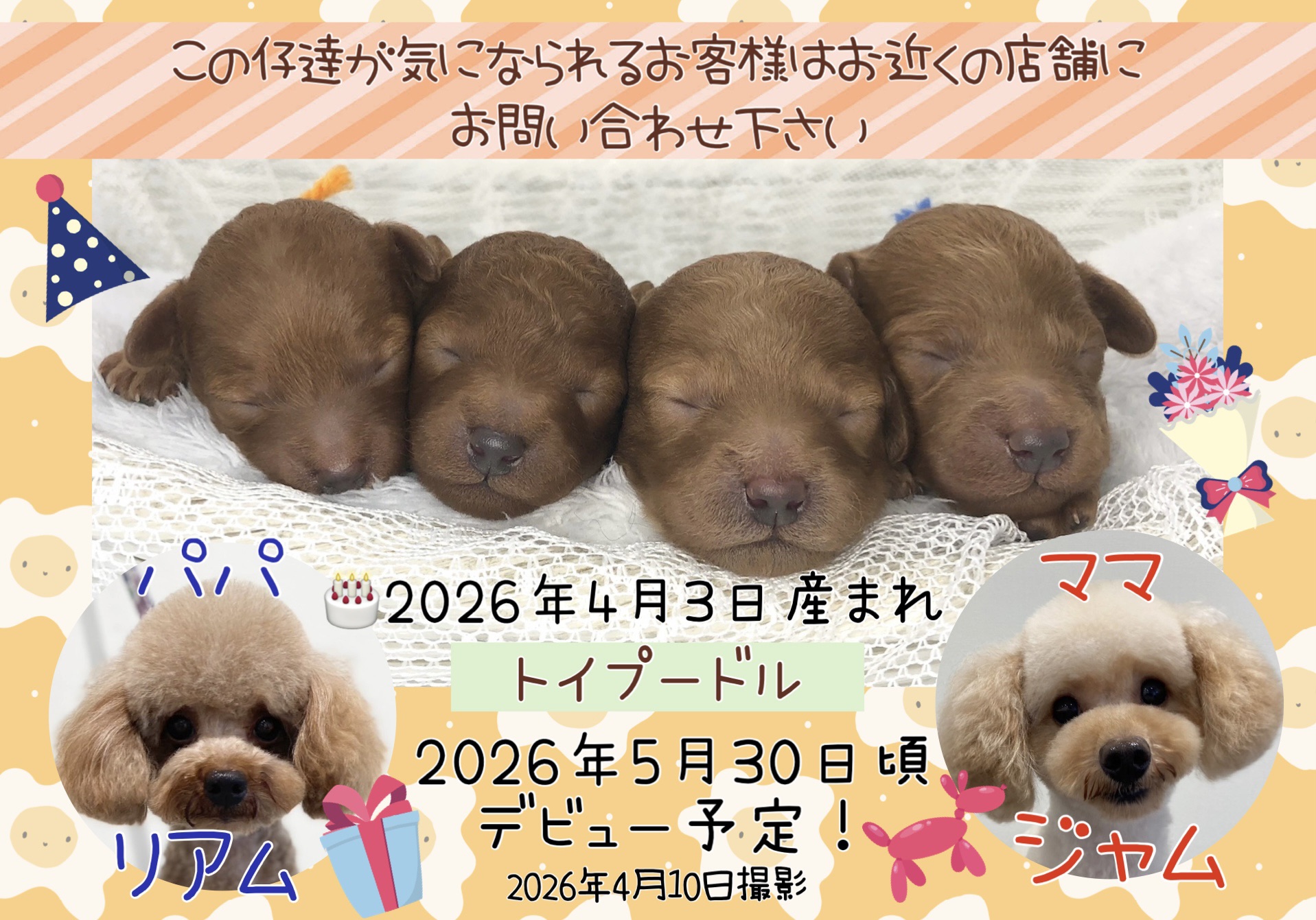 | コメント | トイプードルの男の子1頭♂、女の子3頭♀の4つ仔ちゃん パパ ママ これからの成長が楽しみです デビュー予定日 ※価格は決まり次第、追記致します この仔達が気になられるお客様は、お近くの店舗にお問い合わせください |