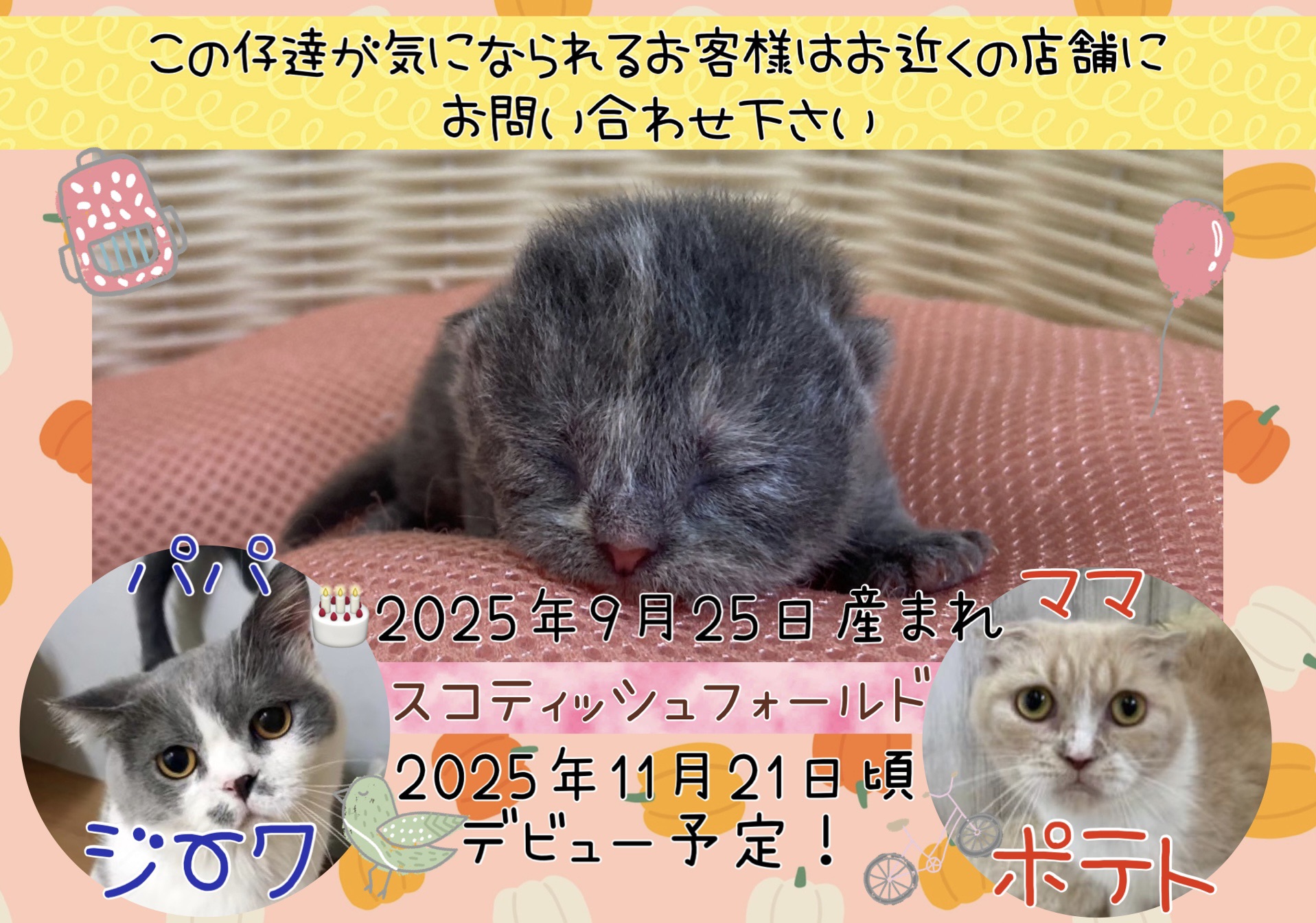 コメント | 元気いっぱいスコティッシュフォールドのひとりっ仔ちゃん パパ ママ デビュー予定日 ※価格は決まり次第、追記致します この仔達が気になられるお客様は、お近くの店舗にお問い合わせください |