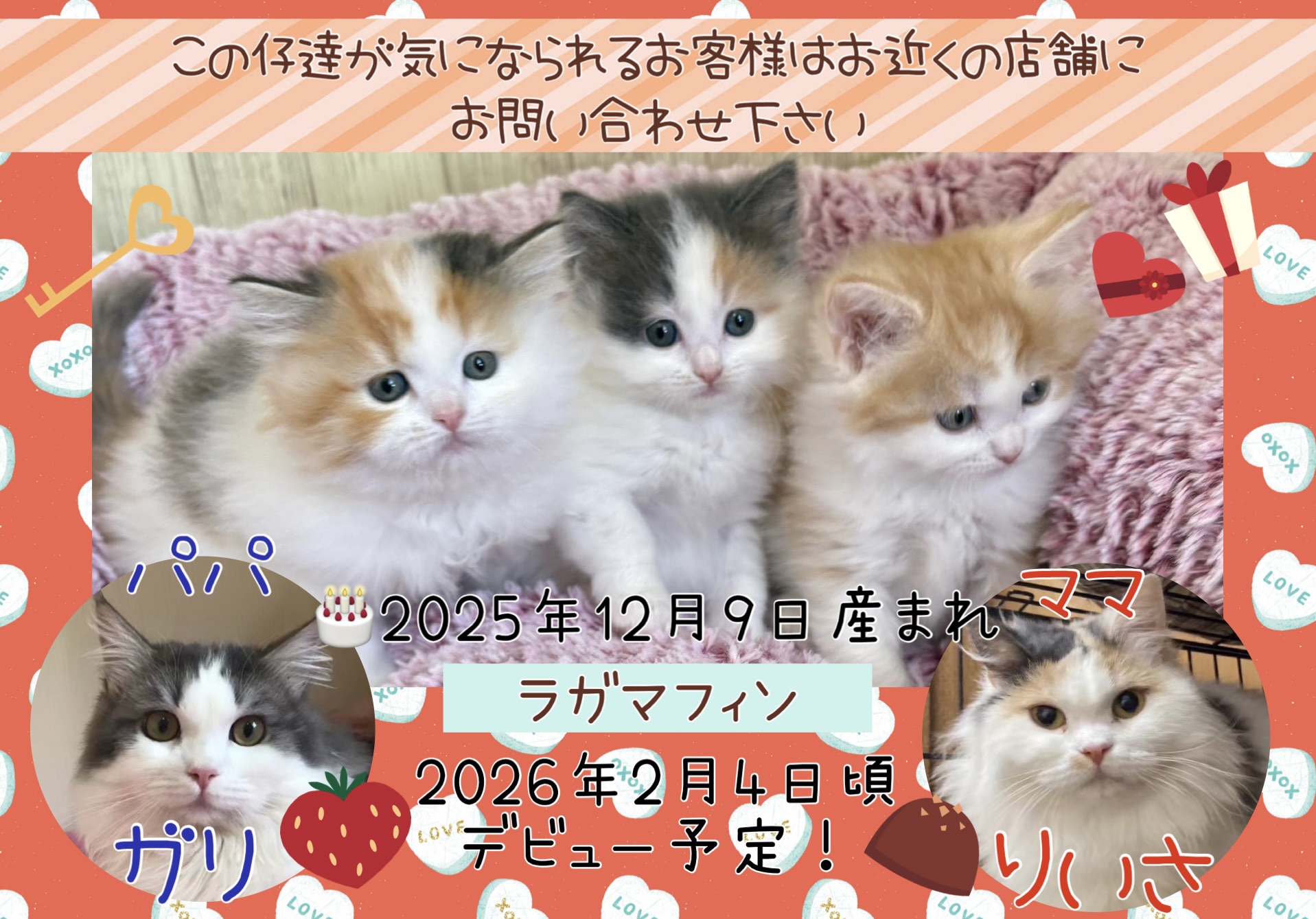 | コメント | 元気いっぱいラガマフィンの3つ仔ちゃん パパ ママ デビュー予定日 〈 価格 〉すべて税込価格となります。 男の子 青リボン ¥338,800-(税込) 女の子 オレンジリボン ¥360,800-(税込) 女の子 ピンクリボン ¥360,800-(税込) ※別途、マルエス安心パック ¥55,000-(税込)がかかります。 この仔達が気になられるお客様は、お近くの店舗にお問い合わせください |