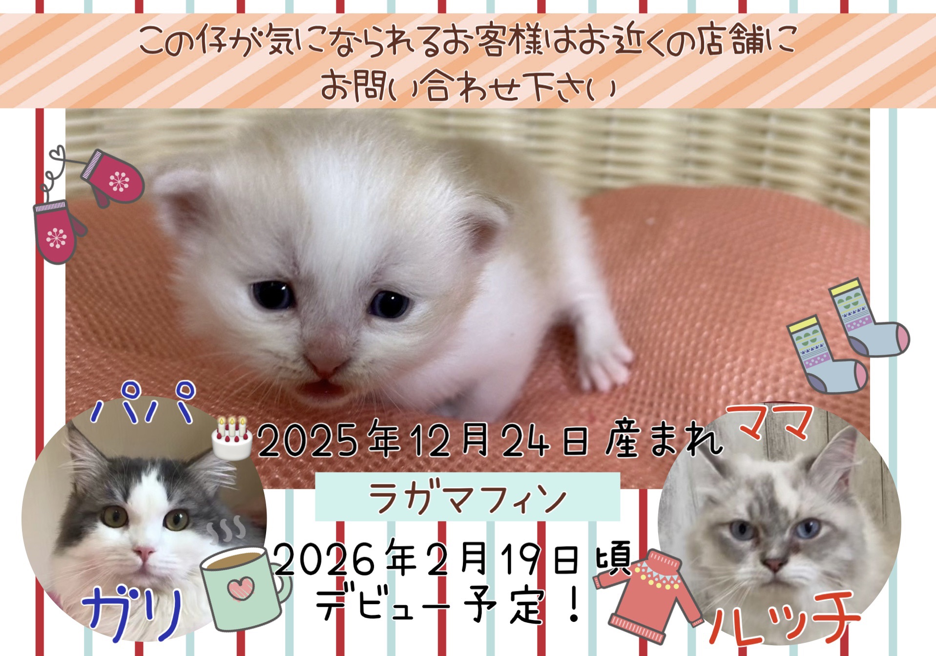 | コメント | 元気いっぱいラガマフィンの一人っ仔ちゃん パパ ママ デビュー予定日 ※価格は決まり次第、追記致します この仔が気になられるお客様は、お近くの店舗にお問い合わせください |