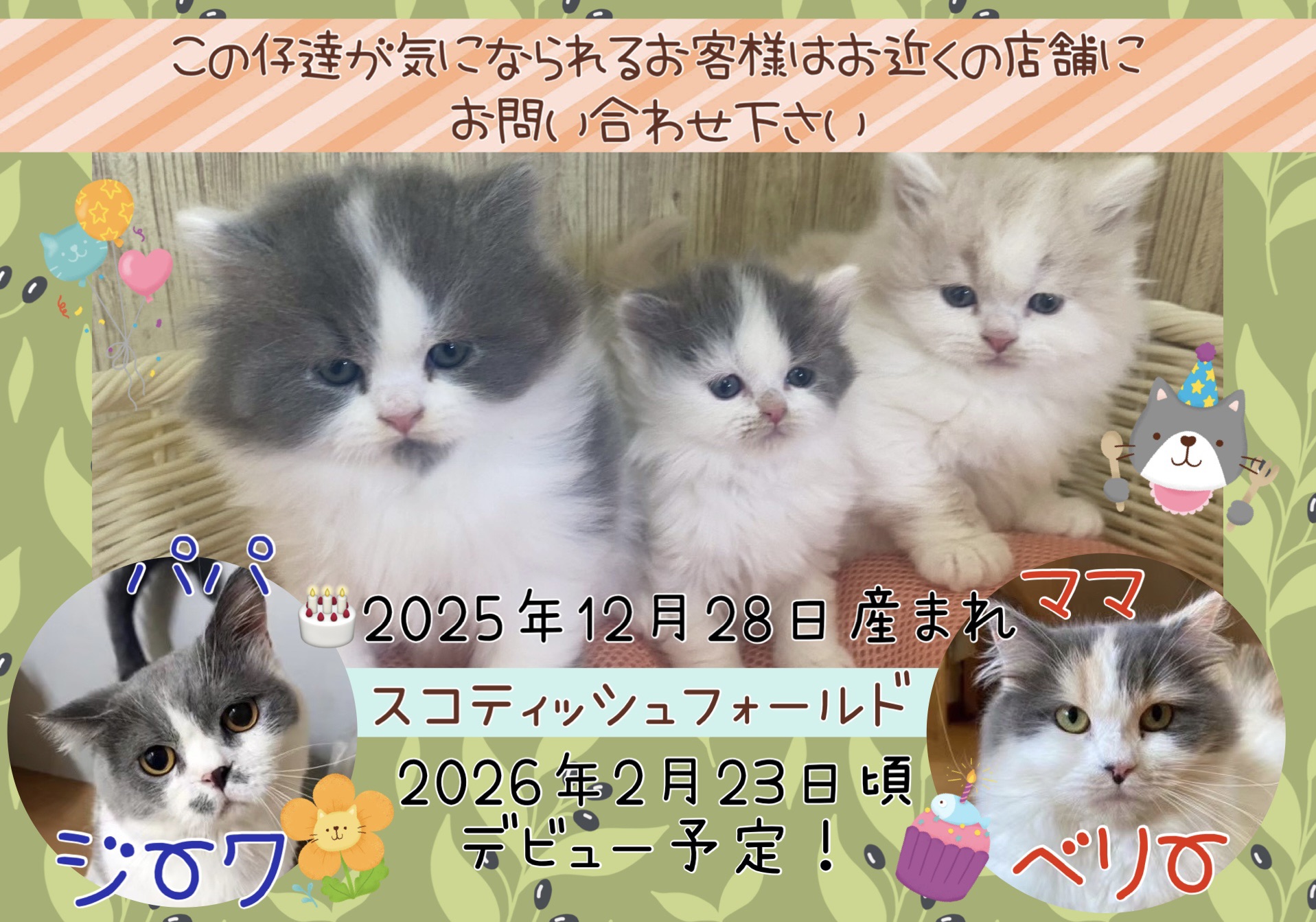 | コメント | 元気いっぱスコティッシュフォールドの3つ仔ちゃん パパ ママ デビュー予定日 ※価格は決まり次第、追記致します この仔達が気になられるお客様は、お近くの店舗にお問い合わせください |