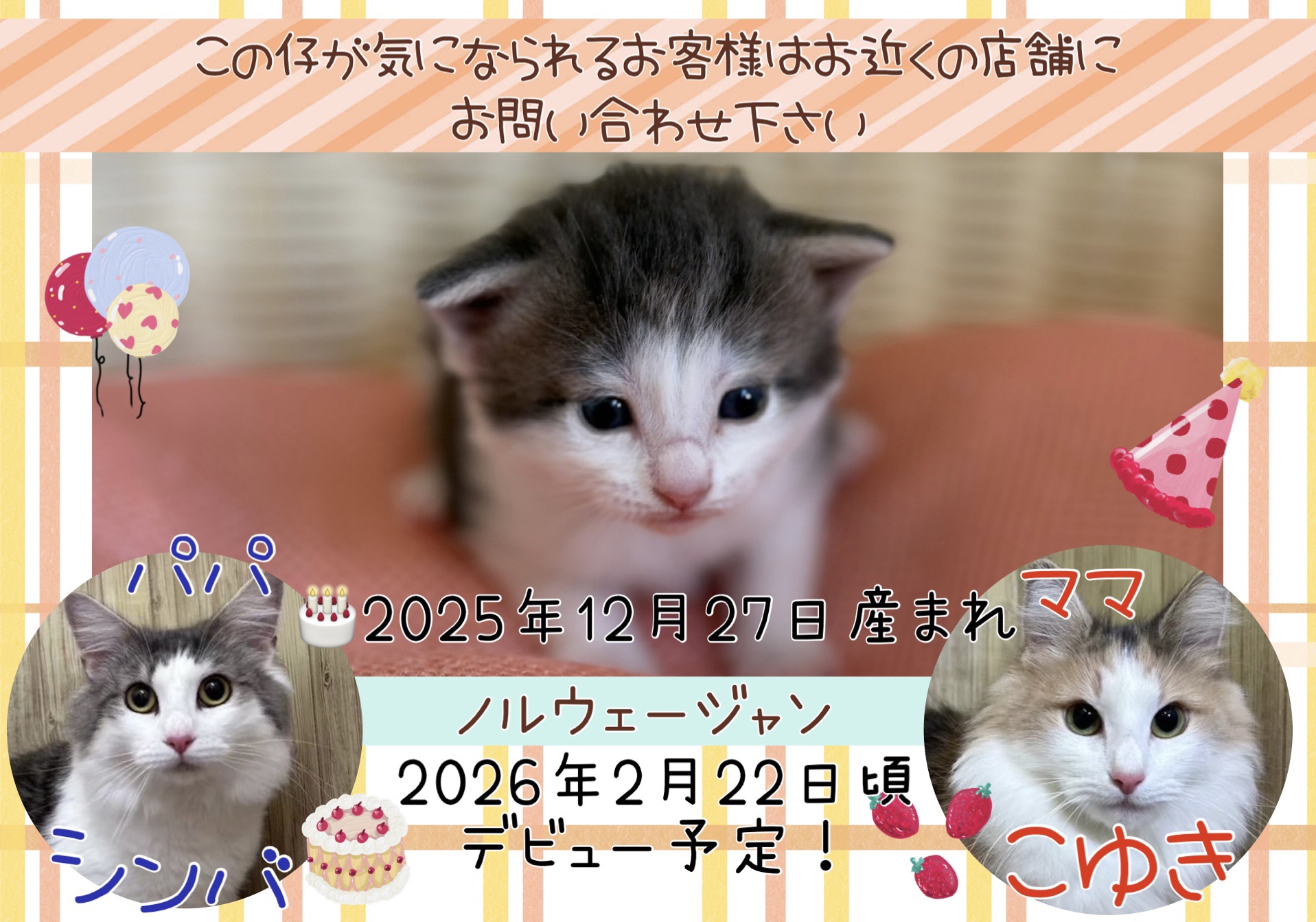 | コメント | 元気いっぱいノルウェージャンの一人っ仔ちゃん パパ ママ デビュー予定日 ※価格は決まり次第、追記致します この仔が気になられるお客様は、お近くの店舗にお問い合わせください |