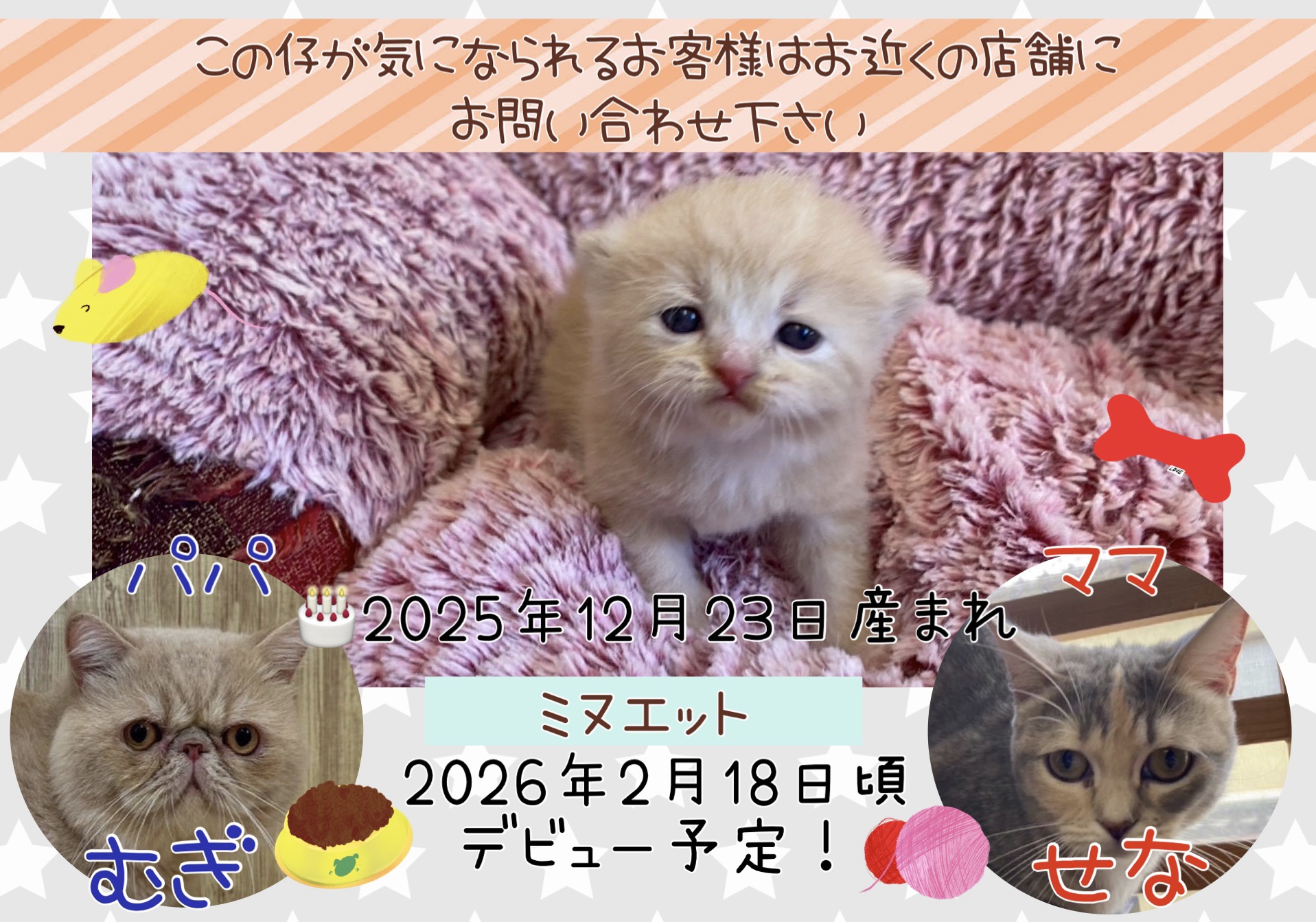 - 気に入った仔が見つかりましたら、最寄りの店舗まで一度ご連絡下さい。