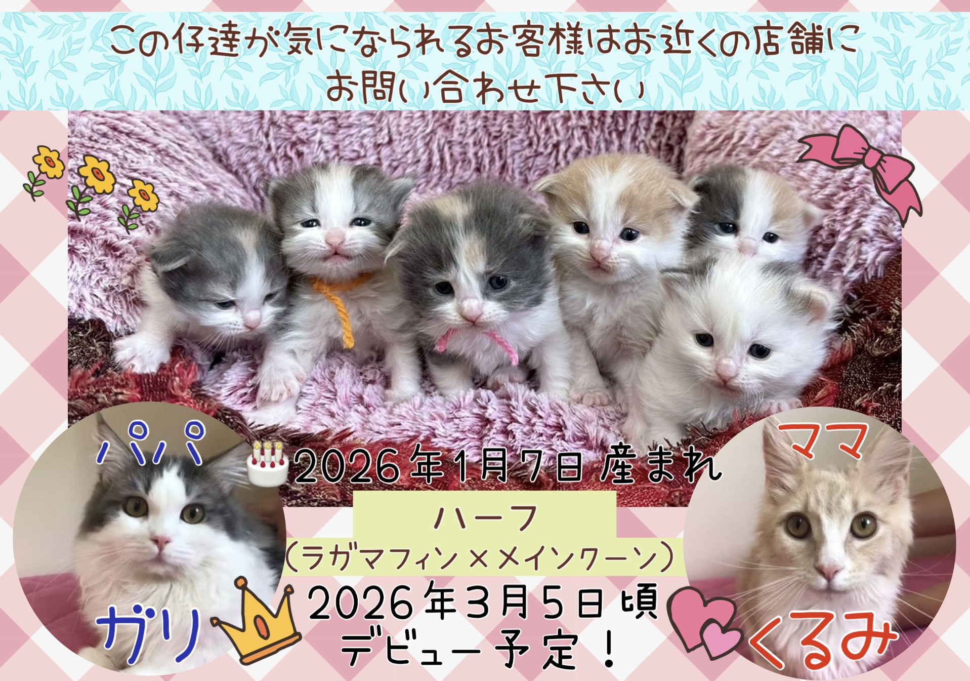 | コメント | 元気いっぱいハーフの6つ仔ちゃん パパ ママ デビュー予定日 ※価格は決まり次第、追記致します この仔達が気になられるお客様は、お近くの店舗にお問い合わせください |