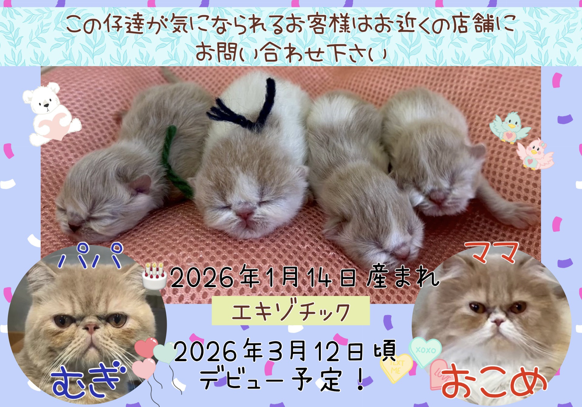 | コメント | 元気いっぱいエキゾチックの4つ仔ちゃん パパ ママ デビュー予定日 ※価格は決まり次第、追記致します この仔達が気になられるお客様は、お近くの店舗にお問い合わせください |
