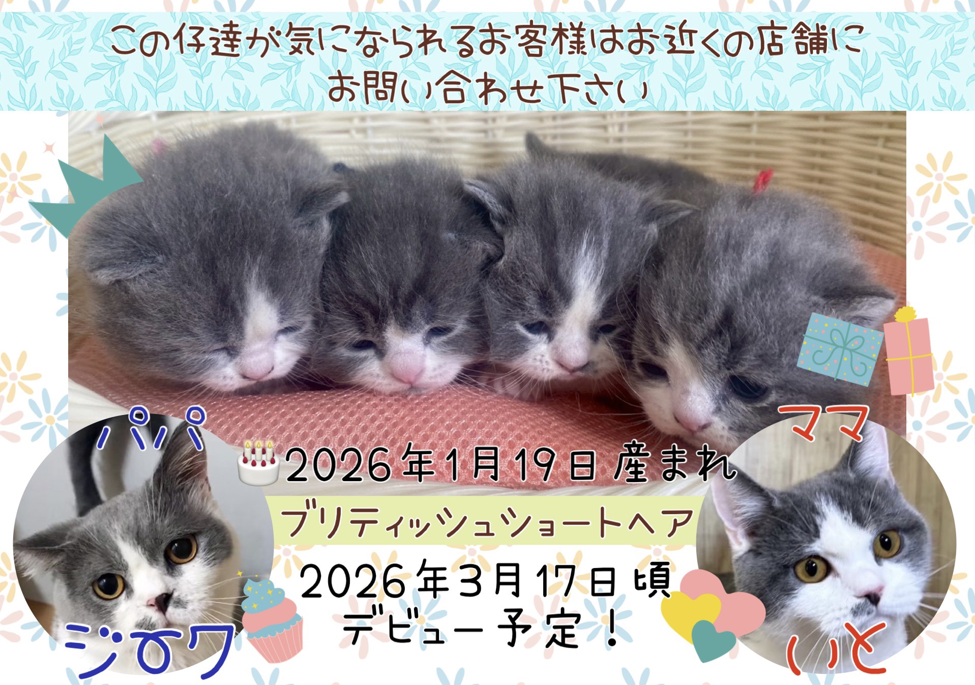 | コメント | 元気いっぱいブリティッシュショートヘアの4つ仔ちゃん パパ ママいとちゃん デビュー予定日 ※価格は決まり次第、追記致します この仔達が気になられるお客様は、お近くの店舗にお問い合わせください |