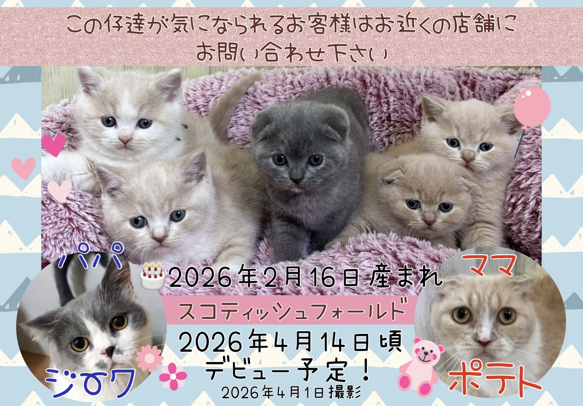 | コメント | 元気いっぱいスコティッシュフォールドの5つ仔ちゃん パパ ママ デビュー予定日 ※価格は決まり次第、追記致します この仔達が気になられるお客様は、お近くの店舗にお問い合わせください |