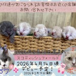 | コメント | 元気いっぱいスコティッシュフォールドの5つ仔ちゃん パパ ママ デビュー予定日 ※価格は決まり次第、追記致します この仔達が気になられるお客様は、お近くの店舗にお問い合わせください |