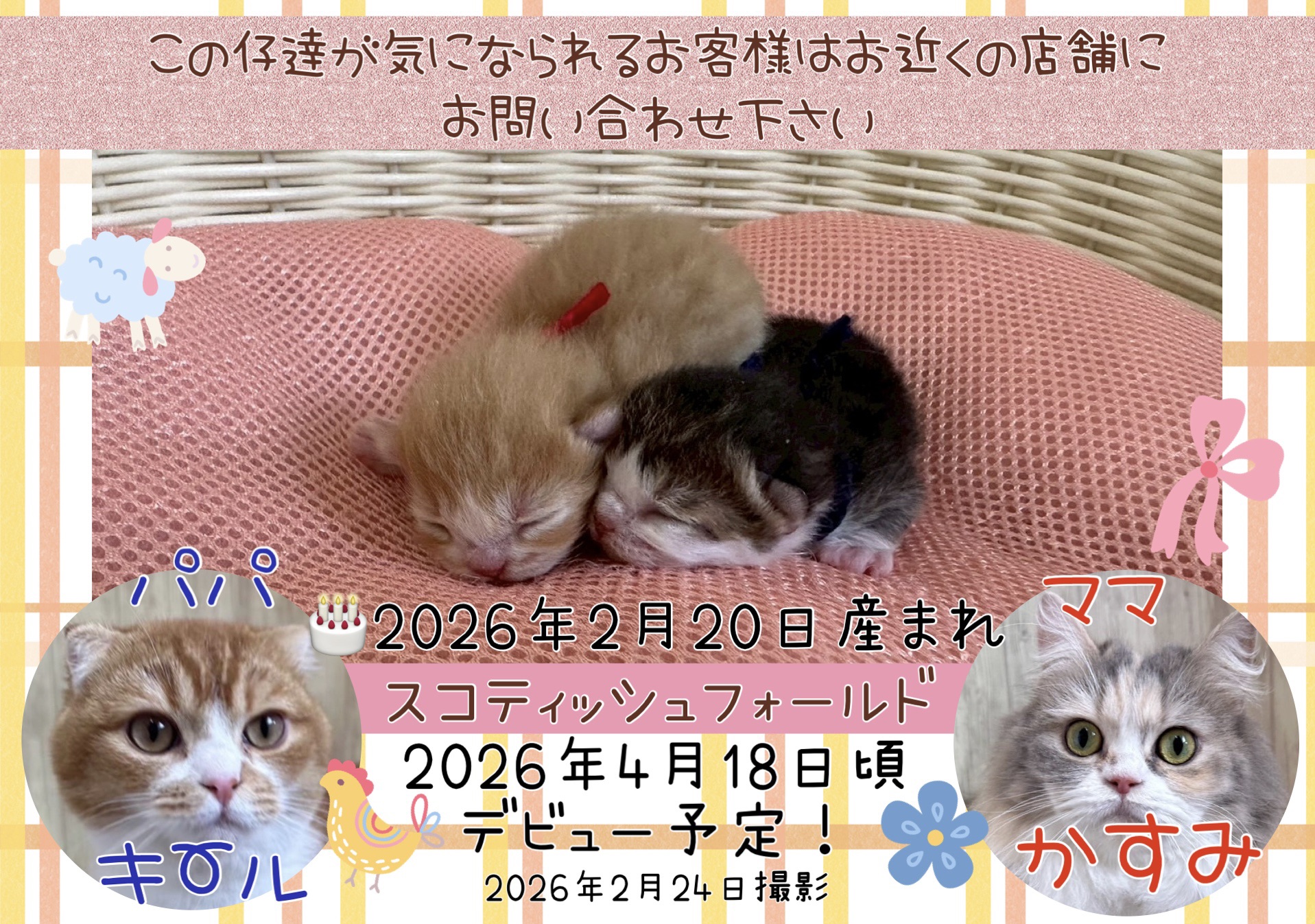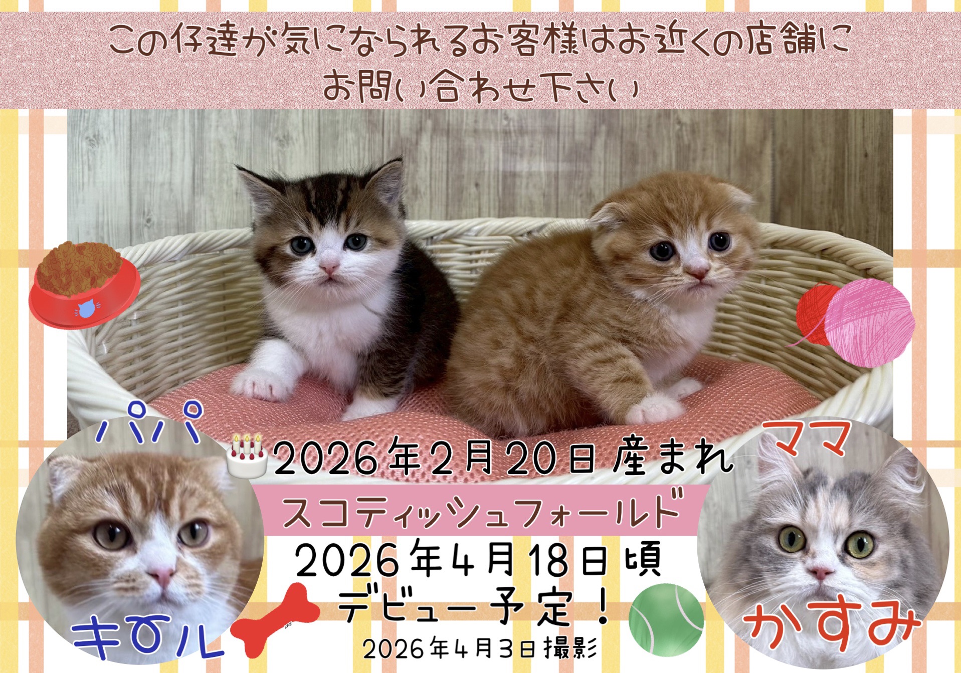| コメント | 元気いっぱいスコティッシュフォールド双子ちゃん パパ ママ デビュー予定日 ※価格は決まり次第、追記致します この仔達が気になられるお客様は、お近くの店舗にお問い合わせください |