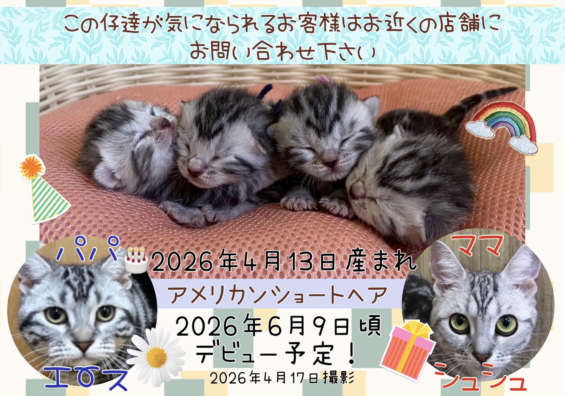 | コメント | 元気いっぱいアメリカンショートヘアの4つ仔ちゃん パパ ママ デビュー予定日 ※価格は決まり次第、追記致します この仔達が気になられるお客様は、お近くの店舗にお問い合わせください |