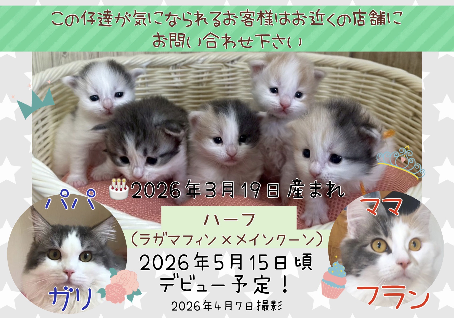 | コメント | 元気いっぱいハーフの5つ仔ちゃん パパ ママ デビュー予定日 ※価格は決まり次第、追記致します この仔達が気になられるお客様は、お近くの店舗にお問い合わせください |